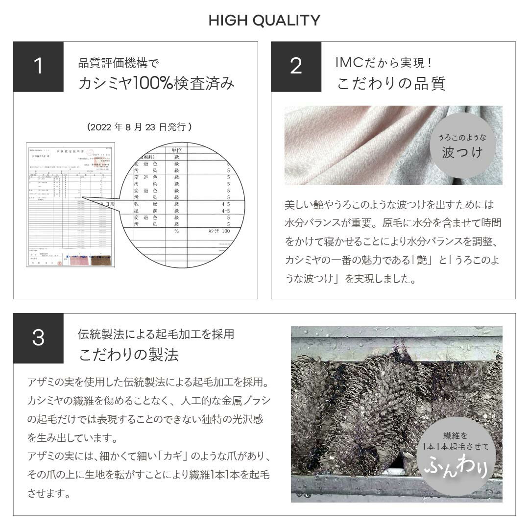 カシミヤは繊度が細く、柔軟で、軽いのにもかかわらず、保湿性・吸湿性に富んでいて、ソフトな風合いがあります。